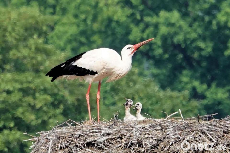Die beiden Jungstörche sind in den letzten Tagen kräftig gewachsen. "In dieser Zeit wurden viele Wiesen gemäht, was immer ein Vorteil ist", stellte Hubert G. Schmid fest. Gleichzeitig hofft Schmid auf baldigen Regen, damit die Altvögel weiterhin genügend Schnecken und Würmer für ihren Nachwuchs finden. Die kahlen, ausgetrockneten Felder machen es den Storcheneltern nicht leicht. Die Zeit bis die Jungstörche flügge werden, reiche laut Schmid auf jeden Fall noch aus.