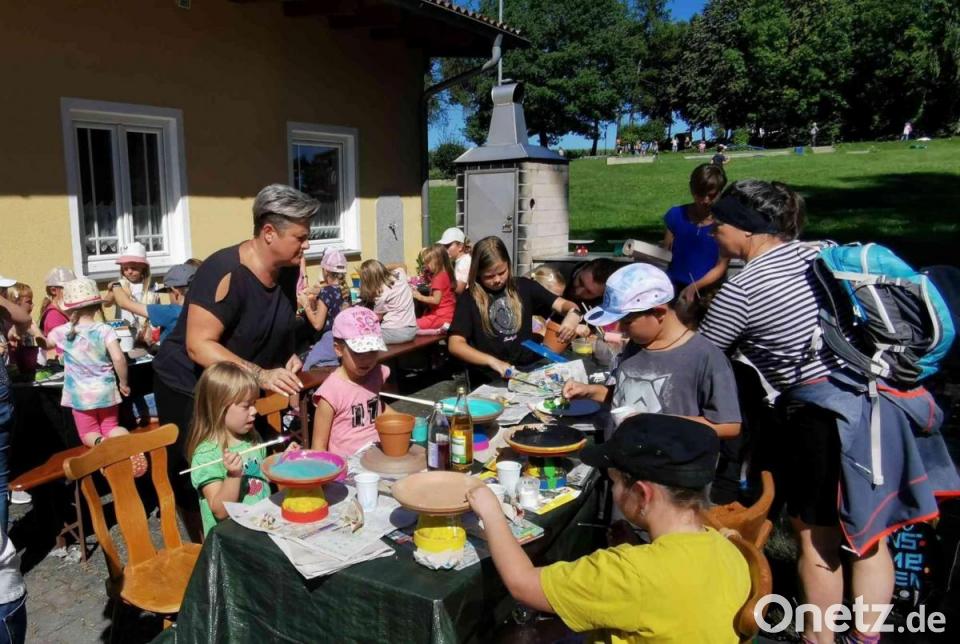 Beim Ferienprogramm an der Freizeitanlage "Atzmannsee" konnten die aktiven Mitglieder vom katholischen Frauenbund und Wintersportverein rund 70 Kinder willkommen heißen. Bestens vorbereitet auf die kreative Bastelstunde hatte sich Carmen Floss mit präparierten Blumentöpfen auf Untersetzern. Mit der bereitgestellten Farbe konnten die Kinder ihre eigene Vogeltränke bunt anmalen und anschließend in der Sonne trocknen lassen.