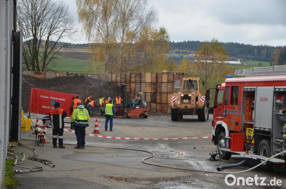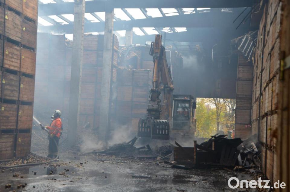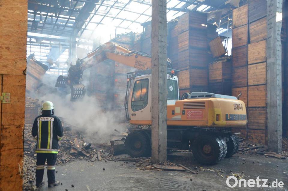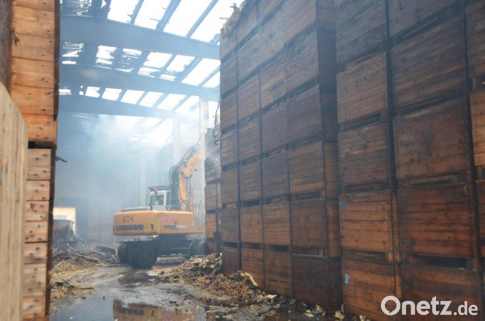 Wenngleich man alles daran setze, so schnell wie möglich zu handeln, um die Rauchentwicklung zu beenden. Diese Arbeiten sollen nach Zielsetzung der Erdäpfelbauern zusammen mit der Spezialabbruchfirma Hierold aus Moosbach unter Zuhilfenahme schwerer Geräte noch an diesem Donnerstag abgeschlossen werden können. Erst dann könne auch die Feuerwehr endgültig abgezogen werden, für die sich dieser Einsatz nach dem Brand am Montagvormittag sehr zeit- und arbeitsintensiv gestaltete und die seither rund um die Uhr im Drei-Schichtbetrieb Brandwache hielten. Die gut 2300 Quadratmeter große „Chipsihalle“ setzt sich durch eine 44 mal 36 Meter große Kistenlagerhalle und des später angebauten Loselagerhaltungsdepots mit 44 mal 17 Meter zusammen.