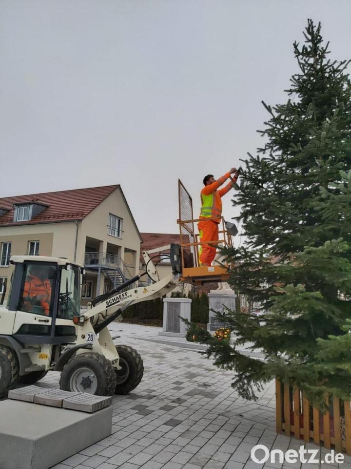 Rechtzeitig zu Beginn der Vorweihnachtszeit ziert eine prachtvolle Nordmanntanne den Tillyplatz. Das Bauhofteam platzierte den rund acht Meter hohen Christbaum mit Thomas Bösl und dessen Neffen Tobias Hanauer. Bürgermeister Reiner Gäbl dankte dem Firmeninhaber des Tannenhofs, der den Baum aus seiner Plantage spendierte. Ab dem ersten Advent werden nicht nur die rund 150 Kerzen leuchten, auch am Marktplatz hat das Bauhofteam den Zoiglbrunnen in einen riesigen Adventskranz verwandelt.