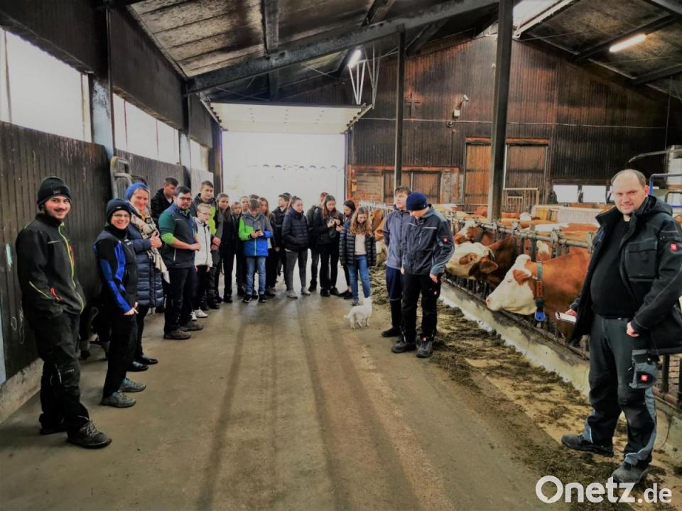 2011 wurde eine Gemeinchaftbiogasanlage mit 16 Landwirten gegründet und 2013 der Betrieb in Richtung Tschechien ausgedehnt. Bereits 2018 kam das Aus des händischen Melkens und ein Melkroboter übernahm die täglichen Melkarbeiten. In den verschiedenen Stallungen erläuterte der 22-jährige Student Hans Rauscher mit Betriebsleiter Thomas Kleber die Arbeitsabläufe und beide wiesen auf 175 Tiere hin, die der "Fleckvieh-Rasse" zugeordnet werden. Auf dem Bauernhof streifen zudem die Hündin "Luna" und acht Katzen umher. Die Haltung der Kühe erfolgt im Laufstall und in Anbindehaltung und die Nachzucht im Stall in Iglus. Neben dem Fressbereich ist der liegende Stallbereich mit Schaumstoffmatten ausgelegt, so dass die Tiere sich beim Niederlegen nicht verletzen und weich liegen. Die Abfälle der Tiere fließen durch einen Spaltboden zur Biogasanlage, die Betriebsleiter Josef Kleber erläuterte.