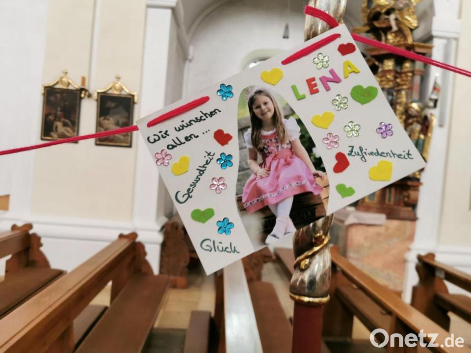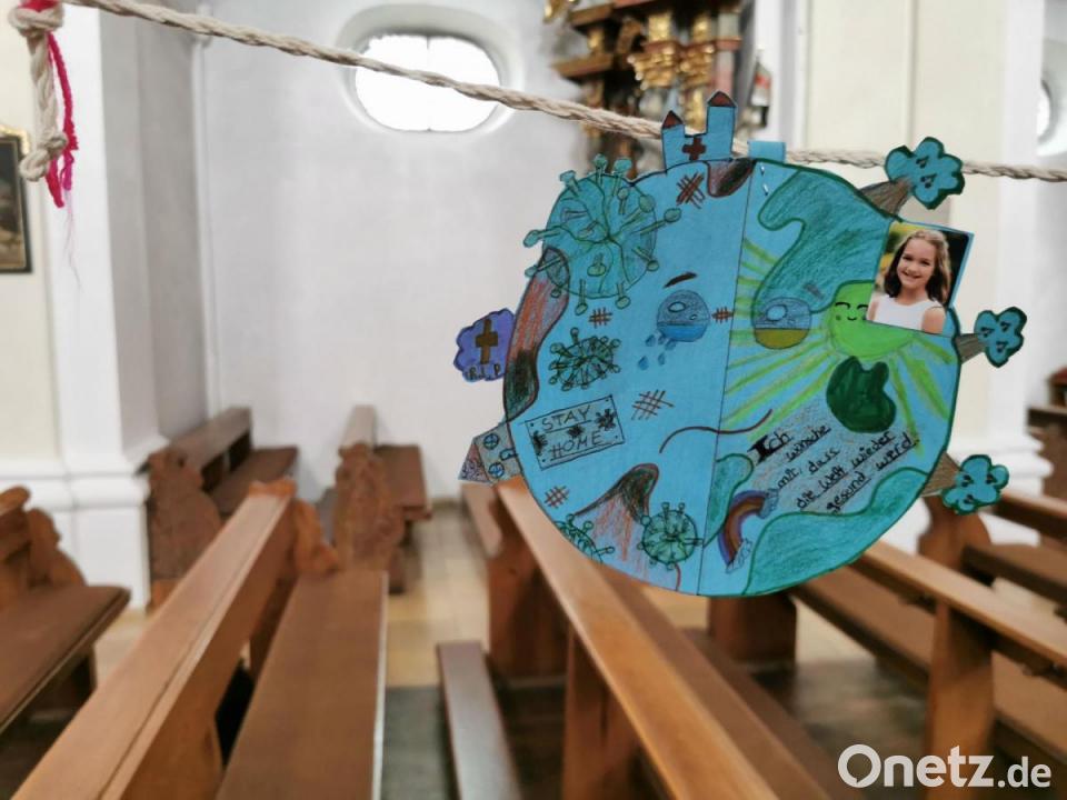 Jeder, egal ob Krippen-, Kindergarten-, Schul-, Kommunion- oder Firmkinder, wurde aufgefordert, sich an der Kordel-Knüpf-Aktion zu beteiligen. Die jüngere Generation fertigte in kurzweiliger Heimarbeit rund 80 Zentimeter lange Kordeln. Die einzelnen Schnüre legten die Eltern mit ihren Kindern in die Bänke der Pfarrkirche und unsichtbare Heinzelmännchen von der katholischen Jugend verschnürten die einzelnen Teile zu einer langen Kordel. Die einzelnen Malbilder, jedes ein Kunstwerk und ein Unikat, und viele Wünsche mit den Namen und einen Bild der jungen Gestalter pendelten an der Kordel und standen als Gemeinschafts-Symbol für eine in guten und schlechten Zeiten verbundene Kirche. Die meisten Kinder wünschen sich, dass das Coronavirus endlich verschwindet, keiner mehr krank wird und sie mit ihren Freunden endlich wieder spielen und vor allem auch Oma und Opa wieder besuchen dürfen. Lena wünscht sich eine Medizin und dass keiner mehr sterben muss. An den Kordeln hängen ausgeschnittene Herzen und Kleeblätter mit der Aufschrift Liebe, Glück, Gesundheit und Zufriedenheit.