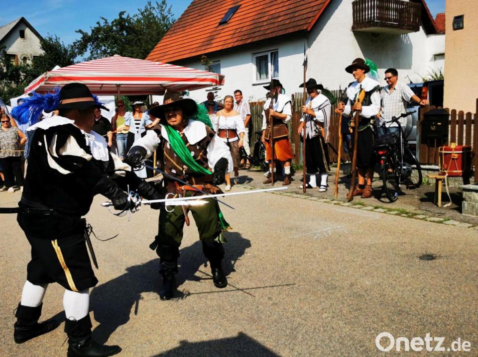 Die Hauptattraktion beim Barthlmarkt in Eslarn war der Aufmarsch des "Weydhauser Fähnleins" mit Bürgermeisterin Margit Kirzinger. In historischen Kostümen und Hüten mit Federschmuck übernahm Hauptmann Andreas Ringholz mit seinen Mannen für kurze Zeit die Oberhand beim Markttreiben und stellte sich mit zwei kurzen Aufführungen ins Rampenlicht.