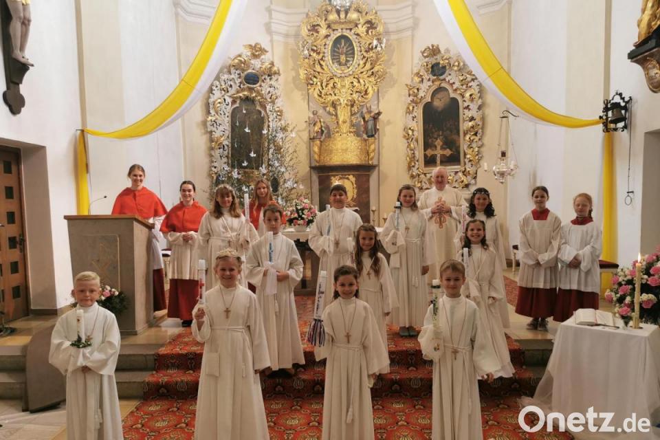 Elf Mädchen und Jungen zogen am Sonntag in einer kleinen Prozession mit Pfarrer Erwin Bauer und den Ministranten vom Rathaus in die Pfarrkirche "Mariä Himmelfahrt". Mit ihren Eltern und Verwandten feierten sie ihre Erstkommunion. Gekommen war auch Schulleiterin Katharina Merther, die den Ablauf in Bildern festhielt. Die Eucharistiefeier eröffneten Mitglieder vom Singkreis mit Vorsängerin Anna-Lena Klug und in Begleitung von Organistin Martina Brenner.