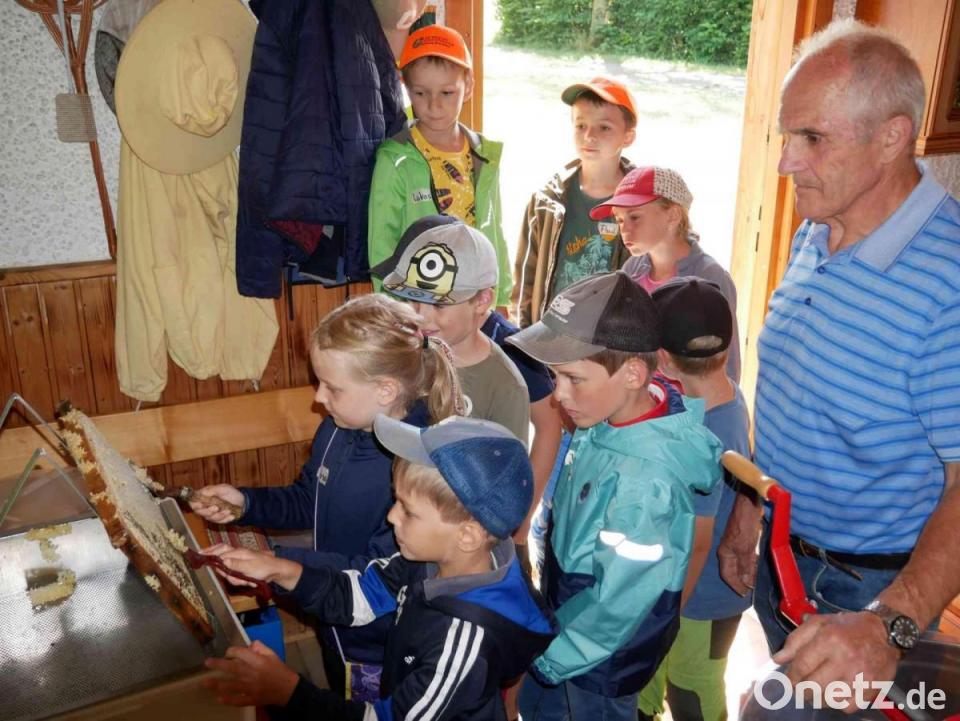Einen Einblick in die Honigproduktion gab zweiter Vorsitzender Johann Bruckner im Vereinsheim. Die Kinder durften unter Anleitung das Wachs von den Waben schaben und nach dem Entdeckeln den Honig aus den Waben schleudern. Die Frage "Wer möchte eine Semmel mit frisch geerntetem Honig?" ließen sich die Kinder nicht zweimal stellen. Auf Schautafeln erfuhren die jungen Besucher viel über das Leben der Bienen mit ihrer Königin und das Herstellen von Honig.