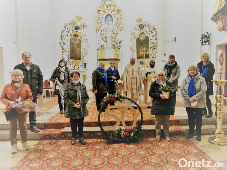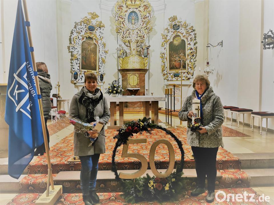 Die steigenden Coronazahlen zwangen den Eslarner Zweigverein des Katholischen Deutschen Frauenbundes (KDFB), die Jubiläumsfeier zum 50. Jahrestag im Pfarrheim abzusagen. Aus Rücksicht auf die Gesundheit der Mitglieder fanden die Ehrungen im Anschluss an den Gedenkgottesdienst in der geräumigen Pfarrkirche statt. Ein wunderbares mit Blumen geschmücktes Kunstwerk mit der großen Jubelzahl 50, eine Jubiläumskerze und eine neue Haltevorrichtung aus Holz für die Vereinsfahne wiesen am Altar auf einen besonderen Festtag hin. Im Vorstand war der Wunsch nach einer Halterung für die Vereinsfahne diskutiert worden. Zwei Tage später überraschte Mitglied Carmen Floss mit den Kunstwerken.