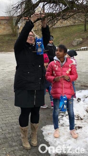 Als Sitz- und Anflugsmöglichkeit dienten am Boden eingeklemmte Holzstöckchen. Mit der Wiederverwertung von Abfallprodukten signalisierten die Kinder der zweimal ausgezeichneten Umweltschule, dass man selbst aus Abfallprodukten nützliche Gegenstände herstellen, die Umwelt durch recyceln entlasten und damit den gefiederten Freunden in der Winterlandschaft helfen kann. Mit dieser Bastelidee lassen sich laut Pamela Sausel selbst Wegwerfprodukte aus dem Gelben Sack wieder zu einem nützlichen Gegenstand machen. Die von den kleinen Hobbyhandwerkern bemalten Milchtüten hatten zwei große Augen, eine Nase und zwei Flügel und waren originelle Hingucker und dekorative Futterstellen. Die Futterstelle glich einer Eule, die in ihrem offenen Bauch leckeres Futter für die Vogelvielfalt vorrätig hält. Beim Befüllen der Vogelhäuschen mit Sonnenblumenkernen und einer Körnermischung und beim Aufhängen der Kunstwerke an den Bäumen im Schulgarten wurden die Kinder von Schulleiterin Katharina Merther und Projektleiterin Pamela Sausel unterstützt. Mit dieser Aktion und den harmonischen Schmuckstücken im Schulgarten laden die Schüler/innen die kleinen Piepmatzen zu einem kleinen Picknick ein. Gleichzeitig dürfen sich die Vögel in den von Kindern gebauten, artgerechten Nistkästen im Schulgarten heimisch fühlen.