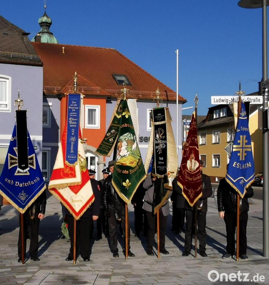 Am Volkstrauertag trafen sich zu Ehren der vielen Zivilopfer, Gefallenen und Vermissten der beiden Weltkriege und der Opfer des Nationalsozialismus die sieben fahnenführenden Vereine, eine Bundeswehrabordnung aus der Grenzlandkaserne Oberviechtach und Vertreter der Marktgemeinde Eslarn und formierten sich mit dem "Eslarner Bläser-Ensemble" um Leiter Stefan Karl zum Kirchenzug. In der voll besetzten Pfarrkirche betete Pfarrer Erwin Bauer um Frieden, erinnerte an das Teilzitat "Schwerter zu Pflugscharen" aus der Bibel mit dem Ziel auf Völkerfrieden durch weltweite Abrüstung und bat die Weltmächte generell auf Waffen zu verzichten.