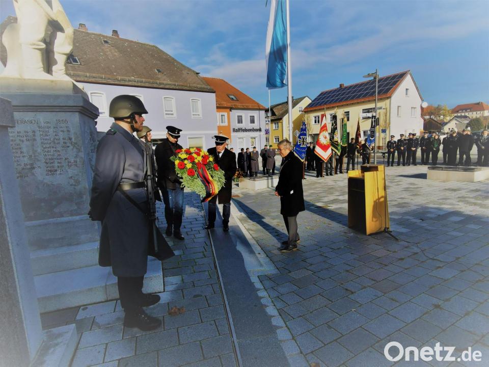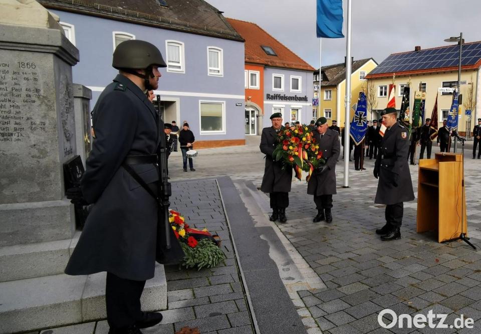 Nach der Messfeier führte ein Gedenkzug unter dem Kommando von Zugbegleiter Klaus Härtl zum Ehrenmal, wo zwei Bundeswehrsoldaten der 1. Patenkompanie die Ehrenwache übernahmen. Am Ehrenmal erinnerten Bürgermeister Reiner Gäbl und Hauptmann Christian Hartl von der 1. Patenkompanie an die beiden Weltkriege, blickten aber auch 1500 Kilometer ostwärts in die Ukraine, wo aktuell in einen menschenverachtenden Krieg schuldlose Menschen ihr Leben lassen müssen. "Der Krieg ist wieder Gegenwart und es ist erschreckend, wenn Menschen aufeinander schießen und aus der Geschichte nichts gelernt haben", formulierte Bürgermeister Gäbl.