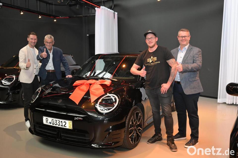 Kevin Brenner aus Eslarn hat beim Gewinnsparen der bayerischen Volks- und Raiffeisenbanken das große Los gezogen. Laut einer Meldung des Gewinnsparvereins Bayern gewann er einen Mini Cooper SE im Wert von rund 40.000 Euro. Die feierliche Übergabe des Fahrzeugs fand in der Mini-Niederlassung in München statt. Regionalmarktleiter Anton Zilbauer und Geschäftsstellenleiter Markus Dimper von der Volksbank Raiffeisenbank Nordoberpfalz gratulierten dem Gewinner herzlich.