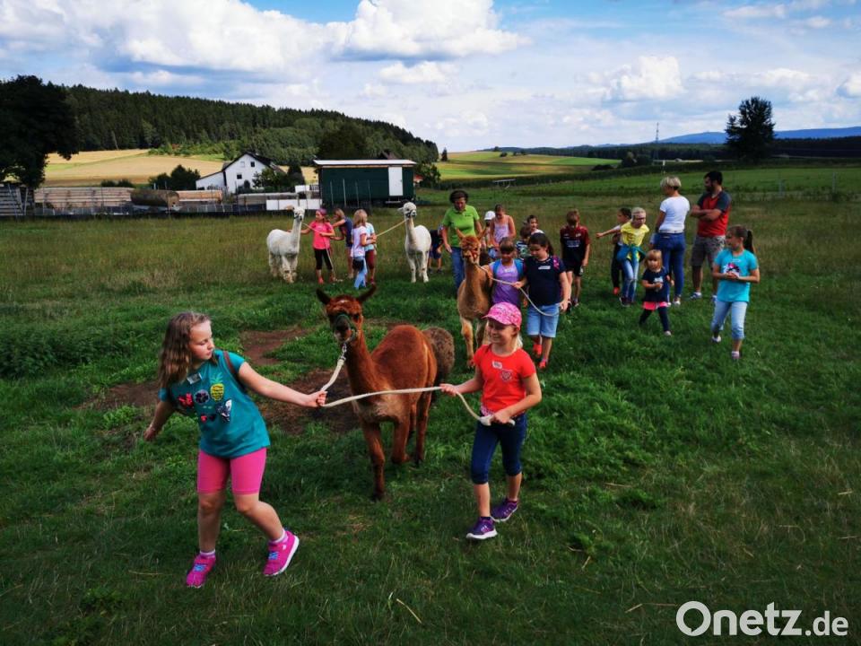 Am Ferienprogramm des katholischen Frauenbundes nahmen über 40 Kinder teil. Die Eltern trafen sich mit der Vorstandschaft am Grießlhof in Burkhardsrieth, wo Bäuerin Elfriede, Bauer Karl, Marlene und Schwiegertochter Michaela Balk ein vielfältiges und kurzweiliges Programm vorbereitet hatten. Die Mädchen und Bubenfreuten sich beim Rundgang durch den Bauernhof über die vielen Hühner, Enten, Gänse, Katzen, Hasen, Meerschweinchen und natürlich besonders über die vier Alpakahengste. Die aus Südamerika stammende Kamelform mit Namen Pakos, wie die putzigen Tiere auch genannt werden, genießen am Grießlhof auf den großzügigen Weiden ein dem Tierwohl gerechtes Dasein. "Die Tiere erfreuen überwiegend unsere, vor allem kleineren Gäste und liefern uns Wolle", sagte Bauer Karl. Mit dem Halfter in der Hand führten die Kinder "Polero", "Sevi", "Landro" und "Soran" durchs Gehege.