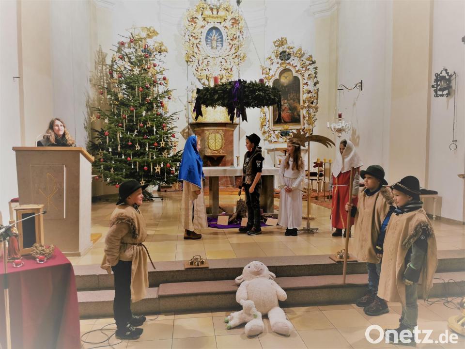 Zu den beiden Krippenspielen an Heilig Abend waren überwiegend Familien in die Pfarrkirche Mariä Himmelfahrt eingeladen. Die ausgewiesenen Plätze waren nach zahlreichen Voranmeldungen mit Abstand von den Kindergarten- und Grundschulkindern mit ihren Eltern und Großeltern bald belegt. Pfarrer Erwin Bauer und Pfarrvikar Basil Bazir Ngwega erinnerten an die Geburt Jesu. "Wenn man sich lange nicht sehen konnte, wünscht man sich immer mehr, wieder mit anderen zusammen sein zu dürfen." Auch wenn man über Telefon, Video und manchmal sogar noch über den Postweg miteinander reden könne, sei der persönliche Kontakt viel schöner. "Diesen persönlichen Kontakt mit Gott spüren die Kirchenbesucher gerade an Weihnachten." Im Anschluss berichteten die Kinder in einem Krippenspiel an Maria, Josef und dem Kind in einer Krippe. Die Regie führte Ilona Grötsch zusammen mit Hannah Helm, Kathrin Kulzer, Cordula Weiß, Anja Eckert und Melanie Frank. Die Mütter hatten mit den Vorbereitungen, Einüben der Texte und Szenen und mit der Umsetzung des Hygienekonzepts mit Schutzmasken einiges zu tun. Die 14 Mädchen und Jungen erinnerten nach dem Lied "Stille Nacht, heilige Nacht" an die vor über 2000 Jahren zugetragene Geschichte und gaben den Szenen kindliche Worte. Der Nachwuchs überzeugte in vier Szenen mit Darstellung und Kostümen. Die Hauptrollen von Maria und Josef teilten sich in den zwei Ensembles Katharina Kleber und Christina Klug sowie Felix Treptow und Johannes Eder. Die Szenen begannen mit der frohen Botschaft an Maria durch einen Engel, mit der Zusammenkunft Maria mit Elisabeth und dem Besuch der Hirten im Stall. "Jesus öffnet uns heute die Welt für die Liebe, die er allen Menschen entgegenbringt."