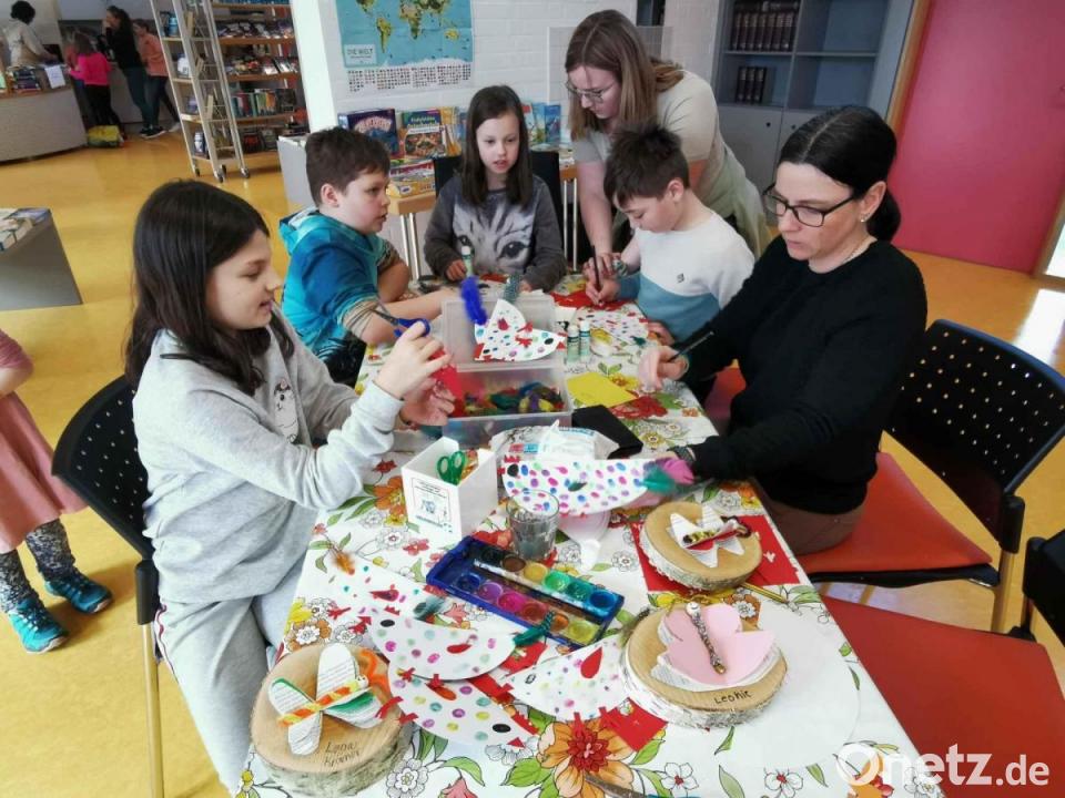 In der Gemeindebücherei Eslarn war kürzlich für zahlreiche Kinder Basteln angesagt. Da das Osterfest vor der Tür steht, war das Thema für den Bastelnachmittag auch gleich gefunden. Auf das Osterbasteln mit Kindern freute sich das Büchereiteam um Leiterin Melissa Brenner. Auf den Tischen lagen alte Bücher, Baumscheiben von Birken, Scheren und Klebepistolen. Das Team wollte nicht mehr brauchbare Bücher nicht einfach aussondern, sondern daraus etwas Dekoratives basteln.