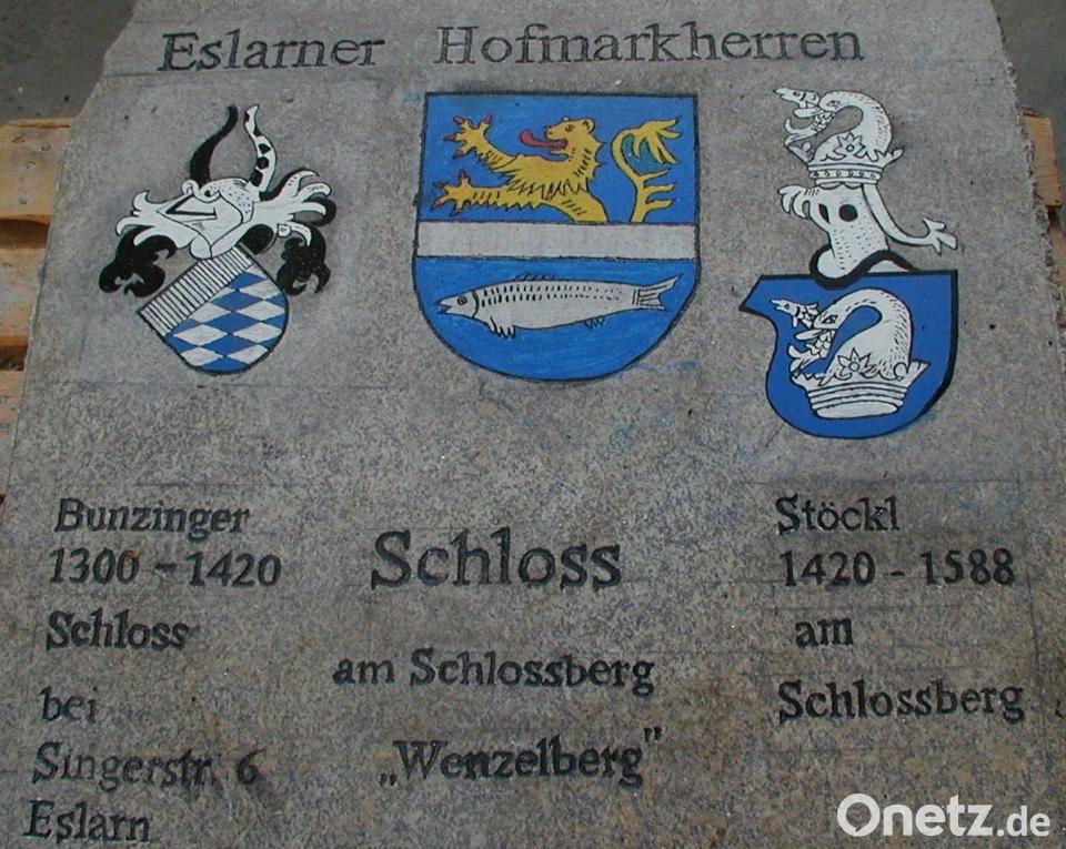 (gz) Das in blau gefasste Gemeindewappen teilt ein silberner Balken in zwei Hälften und zeigt einen goldenen Löwen und unten waagrecht einen silbernen Fisch. Die 1499 erhaltenen privilegierten Rechte und 1567 durch einen Brand vernichteten Unterlagen der Dorfgemeinschaft Eslarn bestätigte 1598 Pfalzgraf Friedrich mit der Verleihung eines Gemeindewappens und 1613 Pfalzgraf Johann mit der Verleihung der Marktrechte.