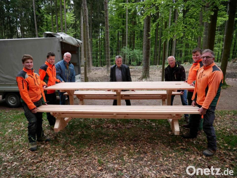 Die Sitzgelegenheiten bieten den zahlreichen Besuchern künftig im oberen Bereich am Spielplatz und im unteren Hirschhege eine Gelegenheit zum Verweilen oder Brotzeitmachen. Die massiven Sitz-Bank-Kombinationen seien eine Bereicherung für den stark frequentierten Wildpark, waren sich alle einig. Nicht nur die handwerkliche Herstellung, sondern auch die sichere Installierung übernahm der Forstbetrieb nach Einweisung durch den Bauhofleiter. Aufgrund des Gewichtes mussten dazu auch Bürgermeister und Forstbetriebsleiter mit anpacken.