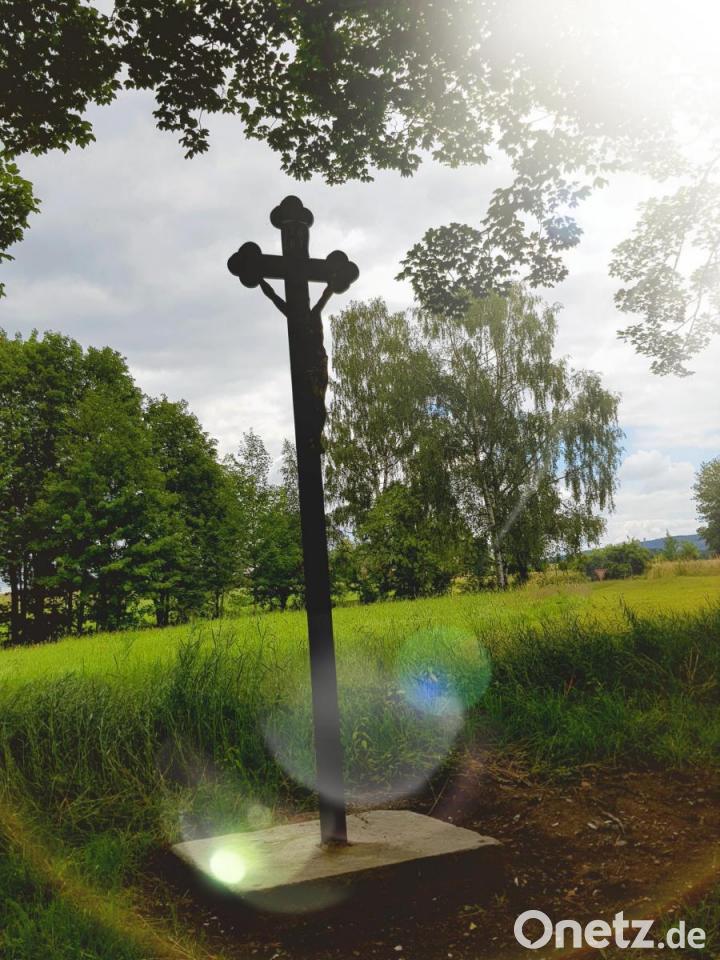 Das drei Meter hohe Gusseisenkruzifix auf flachem Granitsockel entstand um 1900 und wurde für die Denkmalliste „Baudenkmäler“ des Regierungsbezirkes Oberpfalz nachqualifiziert. Jetzt steht das Kreuz zwischen zwei Ahornbäumen und lädt wieder, wie bisher als Bittstation beim jährlichen Flurumgang am Pfingstmontag zum Beten ein.