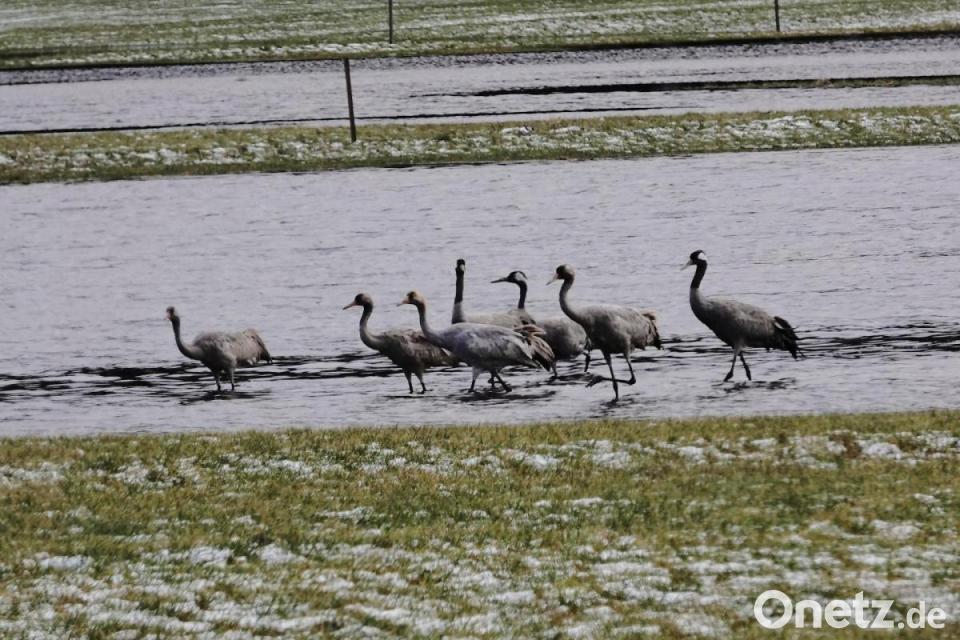 Seltene Gäste waren vor Kurzem auf den Viehweiden vom Staatsgut Pfrentsch in Pfrentschweiher für kurze Zeit zu beobachten. Eine kleine Kolonie von sieben Kranichen nutzte die kurzzeitige Überschwemmung einer Wiese als Rastplatz. "Die Kraniche übernachten stehend im seichten Wasser und schützen sich so vor Raubtieren wie Fuchs, Wolf und auch vor Wildschweinen", erläutert dazu Fauna-Experte Hubert G. Schmid aus Pleystein auf Nachfrage. Die ein- und zweijährigen Kraniche brüten laut Schmid erst im Alter von drei Jahren, so ähnlich wie Störche.