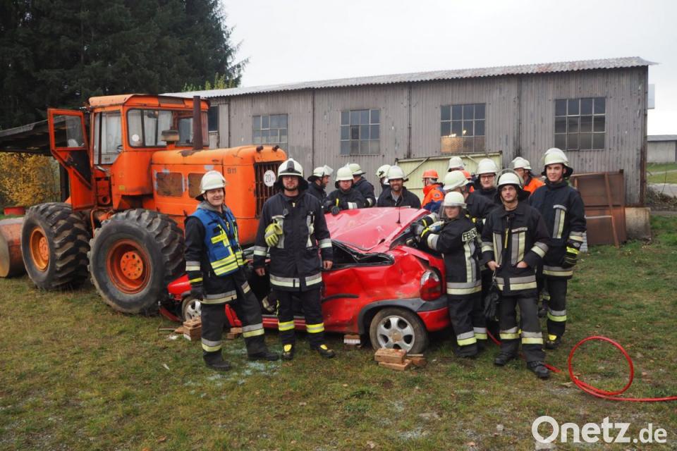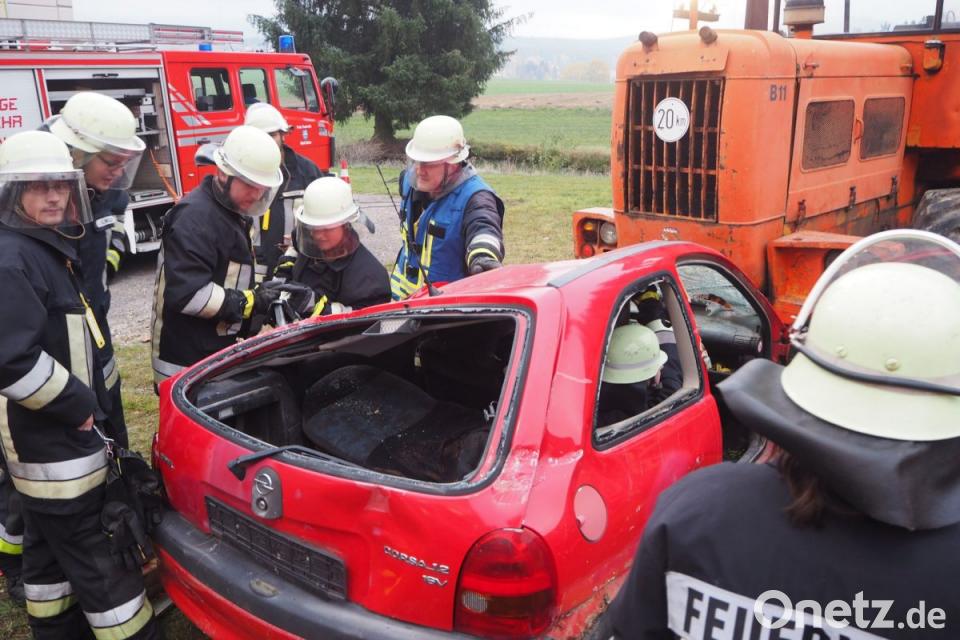 Das Übungsszenario der Freiwilligen Feuerwehr beinhaltete die Rettung eines eingeklemmten Verletzten aus einem Fahrzeug. Der Fahrer eines Opel Corsa hatte einen unbeleuchtet abgestellten Radlader übersehen und war auf die tonnenschwere Baumaschine aufgefahren. An der praktischen Übung bei der Firma "Auto Kaiser" nahmen insgesamt 24 Feuerwehrfrauen und -männer unter der Leitung von Zugführer Jürgen Merold und zweiten Kommandant Christian Wild teil.