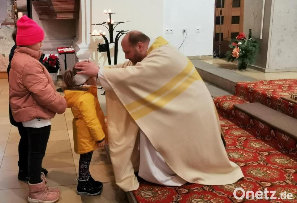 Der Geistliche sprach vom Fest der Liebe und Freude und stellte die Krippe mit dem Jesuskind in den Mittelpunkt. "Lasset die Kinder zu mir kommen und wehret es ihnen nicht, denn solchen gehört das Reich Gottes." Bereits aus dem Bibeltext gehe hervor, dass Jesus die Kleinsten um sich versammelte und sie segnete. So war die traditionelle Kindersegnung zum Abschluss der Messfeier einer der Höhepunkte zum Jahresbeginn. Pater Felix fragte die Kinder nach ihren Vornamen, ging bei den Kleinkindern in die Knie und erteilte den Segen auf Augenhöhe. So legte Pater Felix den Mädels und Jungs die Hand auf den Kopf und begrüßte sie mit dem Segen vor Gott.