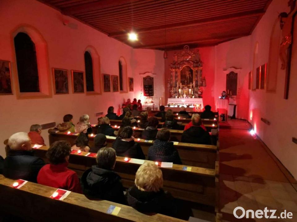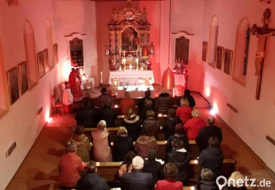 Eslarn war damit eine der wenigen im Landkreis. Mit den blutrot angestrahlten Altären in den beiden Gotteshäusern wollte der Pfarrgemeinderat als Initiator auf das Schicksal vieler Christen aufmerksam machen. Die Organisation übernahm Manuela Klug vom Fachausschuss Liturgie. Jeder der 40 Besucher in der Sebastiankapelle erhielt ein rotes Kerzenlicht und die Gemeinschaft sang in Begleitung der Organistin Martina Brenner "Beschütze deine Freunde, Herr, die in Gefahren schweben". Auf Wunsch von Pfarrer Erwin Bauer stellten Agnes und Klaus Härtl in der Kapelle einen frei stehenden sogenannten Volks-Altar auf, um den der Zelebrant im roten Messgewand mit Kaplan Basil den Gläubigen zugewandt die Heilige Messe feierte.