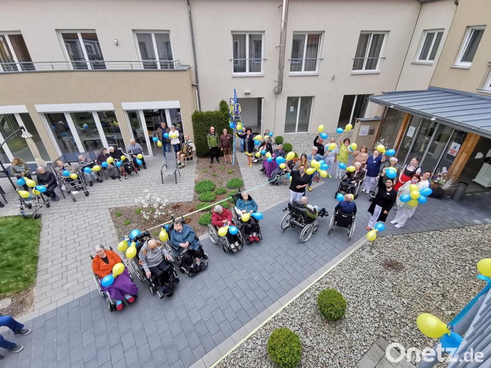 Die 36 Bewohner des Seniorenheims "Haus am Tillyplatz" in Eslarn ließen bei ihrer Maifeier gemeinsam mit dem Personal blaue und gelbe Luftballons in den Himmel steigen und sendeten damit ein Zeichen des Friedens. Gemeinsam formten Pfleger und Bewohner schließlich noch ein Herz für die Menschen in der Ukraine. Auch viele der Senioren wissen, was Krieg und Angst bedeuten. Besonders gerührt über die Solidaritätsbekundungen war Leiterin Alla Sariga, die 1967 in Kiew geboren wurde und deren Gedanken vor allem bei ihrer ein Jahr jüngeren Schwester, deren Mann und 33-jährigen Tochter in Kiew sind. An die Maifeier erinnert am Eingang ein geschmückter Maibaum und ein Spalier von gelb-blauen Ballons an einer Friedensschnur. "Wir wollen unser Mitgefühl mit den Menschen in der Ukraine zum Ausdruck bringen und senden mit unserer Aktion ein Zeichen für Demokratie, Frieden und gegen den Krieg an die Ukraine", hieß es aus dem Seniorenheim.