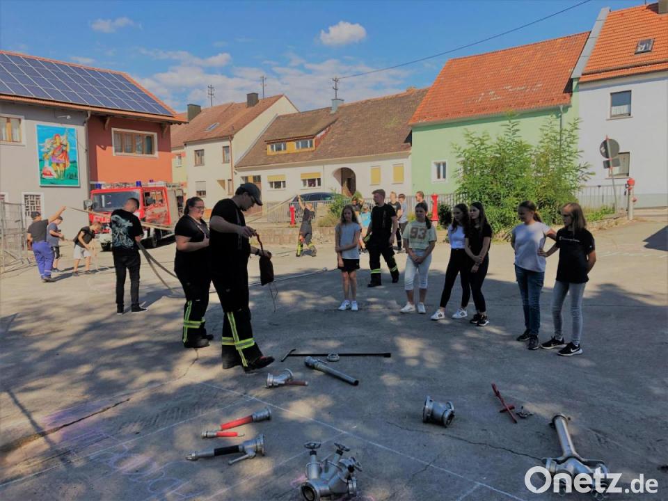 Auch eine kleine Feuerwehrübung und das Handhaben der Gerätschaften waren Thema. So wurden die Löschfahrzeuge vorgestellt und die vielfältige Beladung erklärt. Die Jugendlichen übten auch das Ausrollen von Schläuchen und das Erkennen von Gegenständen. Außerdem gab es eine Vorführung einer Schutzausrüstung mit Atemschutzgerät und eine Schauübung zum Thema "Wasseraufbau". Dabei wurde deutlich, dass die Feuerwehr zwar eine freiwillige Aufgabe ist, für die Mitglieder aber auch bestimmte Anforderungen gelten.