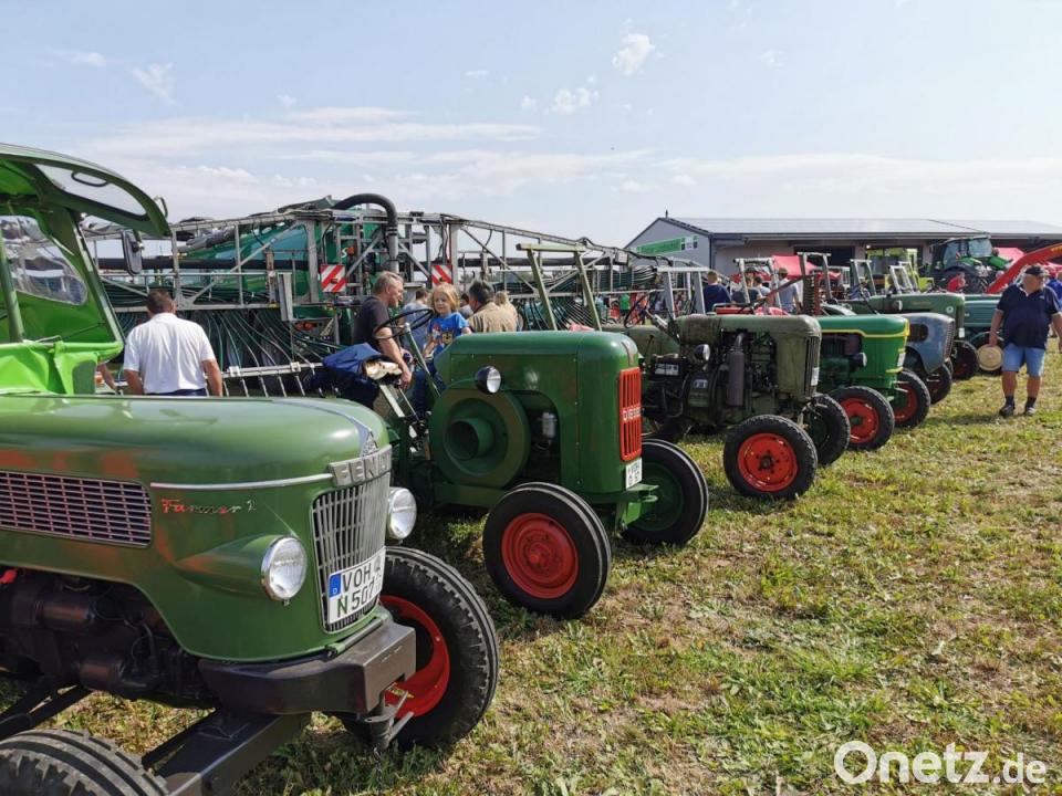 Bereits am Vormittag nutzten Besucher die Gelegenheit zu einem Rundgang durch die Ausstellung. Während es sich viele auf den Bänken bequem machten, reihten sich eine große Anzahl von Bulldogs Blech an Blech. Stark vertreten waren die Oldtimerfreunde aus Moosbach. Zum Vergleich für die Entwicklung in der Landwirtschaft präsentierten die Firma Distner und einige Landwirte einige neuzeitigen Maschinen und ließen dabei die Zeitreise durch die Geschichte der Landwirtschaft lebendig werden. Die Großausstellung umfasste rund 100 Bulldogs, Autos, Zweiräder und landwirtschaftliche Großfahrzeuge mit Anbaugeräten. Darunter einige kleinen Balkenrasenmäher, Garten- und Bulldogmäher, die vor allem die jüngeren Gäste in Beschlag nahmen.