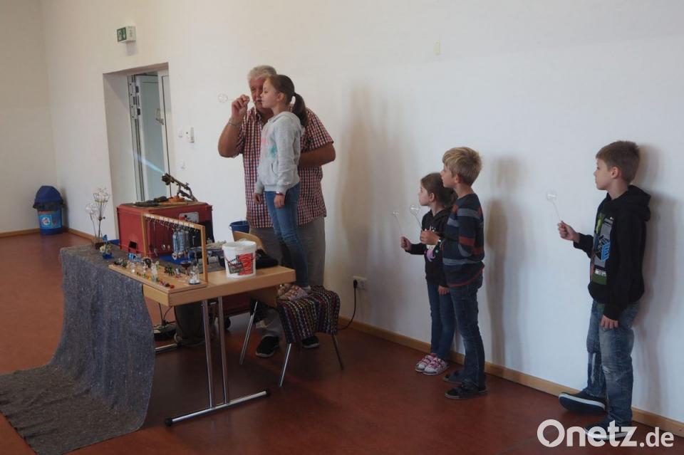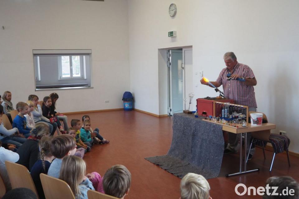 Die Kunst des Glasblasens in Theorie und Praxis zeigte Wolfgang Sinne aus Coburg den Kinder der vier Grundschulklassen. Der Fachmann verstand es in der Schulaula kindgerecht sein Handwerk zu präsentieren und den Schülern das Glasblasen näher zu bringen. Mit dem Scherzglas und Spaßvogel kam auch der Humor nicht zu kurz.