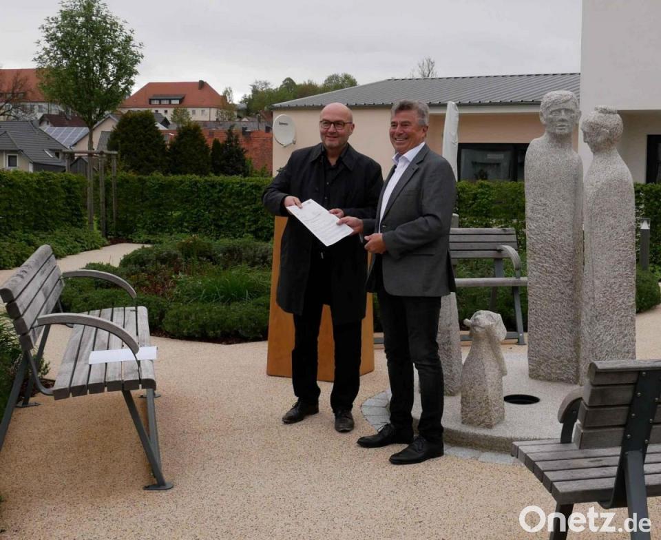 Den Zuschlag für die Umsetzung des mittig im Park platzierten Kunstprojekts erhielt unter fünf eingereichten Künstlern der Steinbildhauer und Zeichner Andreas Prucker aus Regensburg. "Die geneigte Schale zeigt, dass im Leben immer etwas schief laufen kann und die darauf stehenden Steinfiguren stellen drei Generationen dar", beschrieb Prucker.