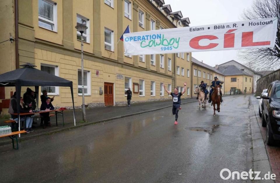 Beim Zieleinlauf in Hostau wurden die Siegerläufer durch eine Reiterin und einen Reiter in alten Uniformen begleitet. Nach knapp zwei Stunden kamen die letzten drei Läufer in der tschechischen Stadt Hostau an. Als Preise für die ersten drei Siegergruppen spendierten die beiden Bürgermeister aus Hostau und Belá Bier und jeder bekam ein Erinnerungsfoto vom Probestart aller Teilnehmer in Eslarn. Zur Stärkung gabs eine böhmische Gulaschsuppe und Getränke. Der sportliche Teil mündete in ein gemütliches Beisammensein.