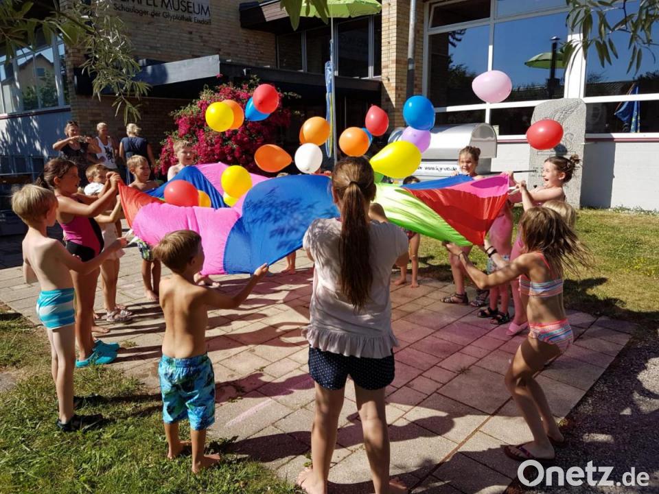 Angesichts der sommerlichen Temperaturen und des schönen Wetters drehten sich viele Stationen des aufgebauten Spieleparcours um Wasser und Strand. So sorgten neben Eierlauf, Fußball, Kästchenhüpfen oder Angelspiel vor allen Dingen das aufgestellte Pool und die Sprinkleranlage für die nötige Abkühlung. Spaß machte auch eine Schlacht mit Wasserbomben.