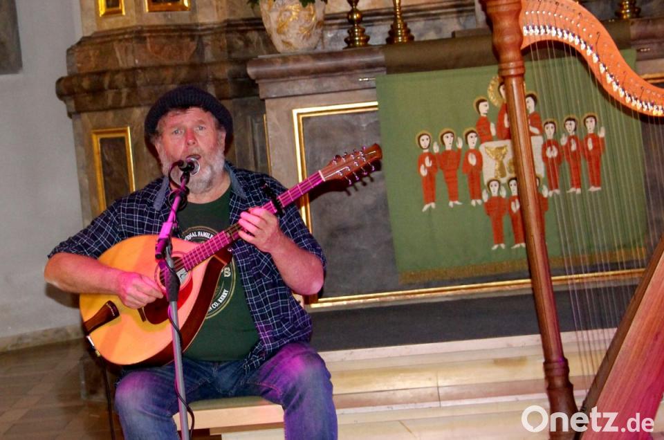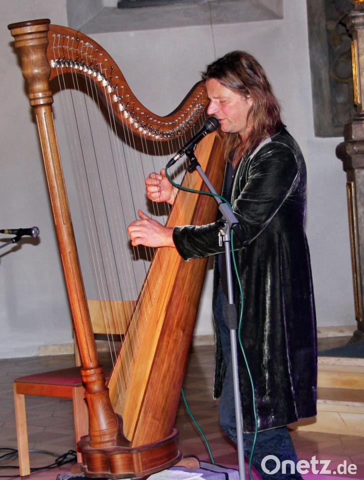 Im zweiten Abschnitt überzeugte Andy Lang, der nicht nur exzellent die Gitarre melodisch und harmonisch einsetzte, mit seiner Harfe. Auch hier gingen ihm Melodie und harmonische Begleitung mühelos von der Hand. Seine Erläuterungen zwischen den Liedern handelten von Sehnsucht, Mut zum Leben und bestaunten die göttliche Natur. Er beklagte den Verlust der Beschaulichkeit, der ihm bewusst wurde bei Betrachtung der Gezeiten im Atlantik. An den Gesang und die Instrumentalmusik dieses Abends knüpfte er die Hoffnung auf neuen Spirit für die Kirchengemeinschaft.