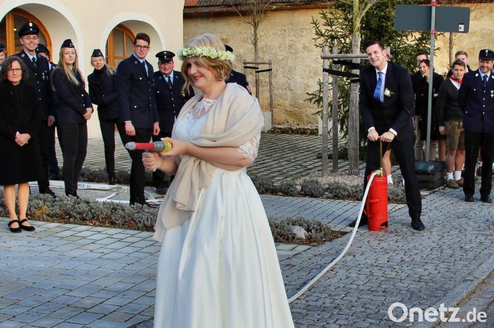 Der Bräutigam, nicht nur Dienstherr der Feuerwehren, sondern selbst auch aktives Mitglied der Etzelwanger Wehr, musste sich mit seiner Braut bei einer Löschprobe mit der Kübelspritze beweisen. Die Kirwapaare warteten mit ihrer Etzelwanger Hymne auf. Das Hochzeitspaar wohnt zurzeit in Penzenhof. Beide haben sich für den Familiennamen Berr entschieden. Sie erfreuen sich zweier gemeinsamer Kinder, Mika (zwei Jahre) und Etienne (ein Jahr) und sind stolz auf den 16-jährigen Sohn Amel, den die Braut mit in die Ehe bringt ebenso wie auf Valentina (19) und Luca (16) aus der ersten Ehe des Bräutigams.