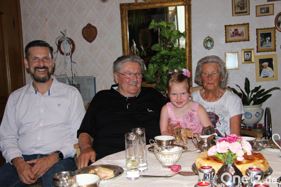 Gesundheitliche Probleme veranlassten den Ehemann, zum Versicherungskaufmann umzuschulen. 1976 zog die Familie nach Etzelwang, wo sie sich in der Schulstraße ein Haus kaufte. Die diamantene Hochzeit veranlassten Familienangehörige, Verwandte, Nachbarn und Freunde, Eva und Wolfgang Weiß – im Bild mit Urenkelin Mia – Glückwünsche und Geschenke zu übermitteln. Landrat Richard Reisinger und die Landtagsabgeordneten Harald Schwartz und Reinhold Strobl gratulierten schriftlich. Zu den guten Wünschen seitens der Gemeinde überreichte Bürgermeister Roman Berr (links) einen Gutschein und Blumen. Bild: ds