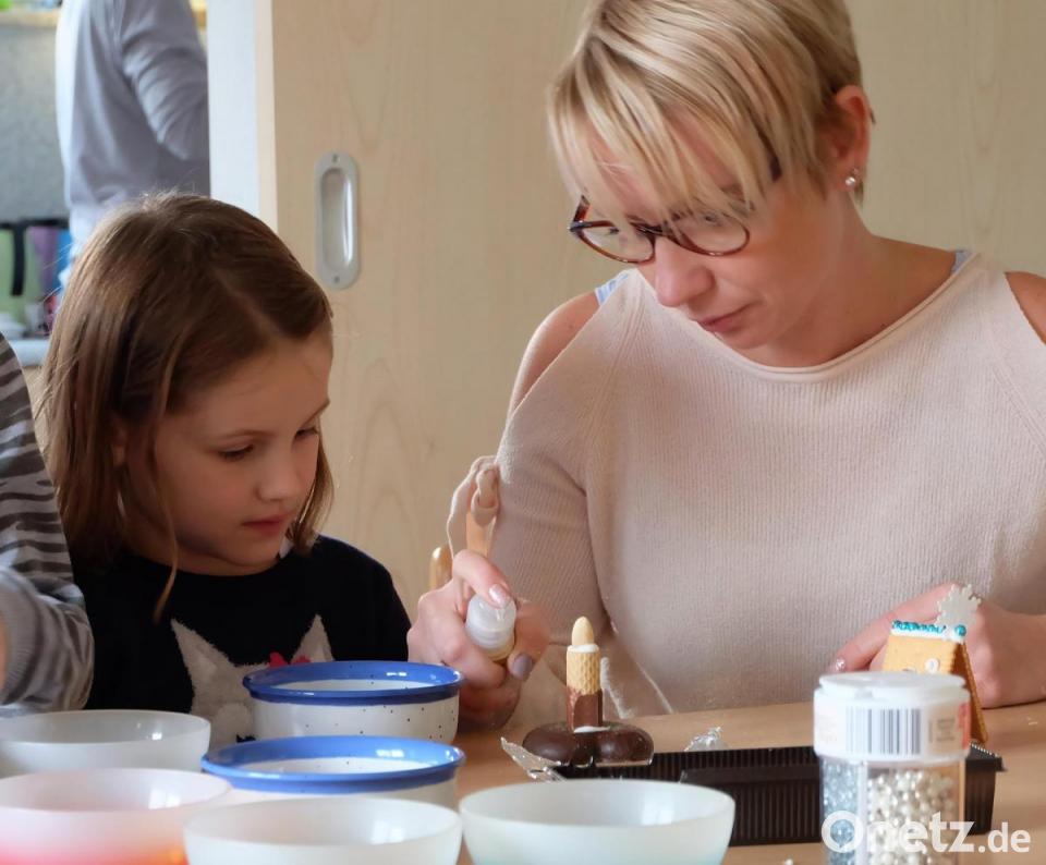 Besonders angestrengt waren die Kids beim Bauen von Lebkuchenhäusern aus Keksen, Schokolade und Zuckerzeug und sie freuten sich über die vielen Dinge, die sie dann mit nach Hause nehmen durften.
