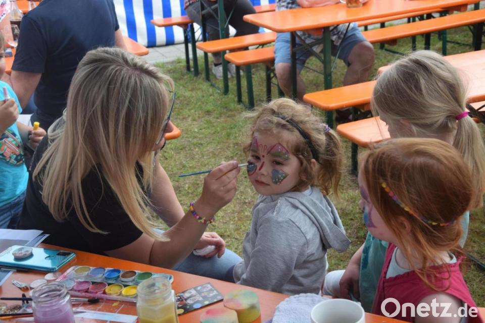 Am Sonntagnachmittag spielte dann die Etzenrichter Blasmusik auf. Der Festplatz war voll und das Zelt gut besetzt. Hier war auch die Kaffee- und Kuchenbar der Frauen. 40 Kuchen und Torten waren gebacken und größtenteils auch verzehrt worden. Im Außenbereich gab's für die Kinder eine große Hüpfburg, die Feuerwehr bot den kleinen Gästen ein Zielspritzen mit der Kübelspritze an. Wer sich beim Kinderschminken anstellte, musste etwas Geduld mitbringen.