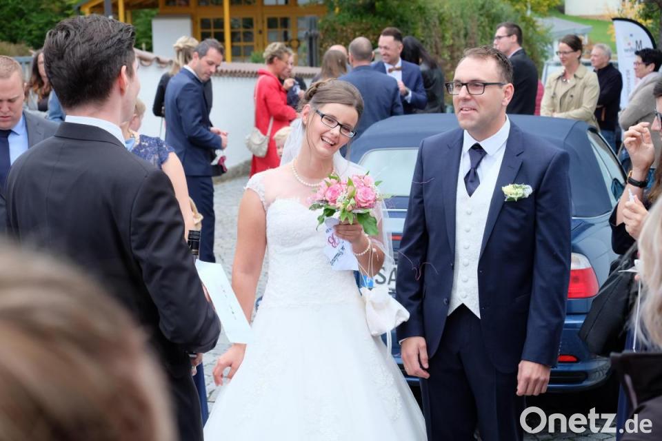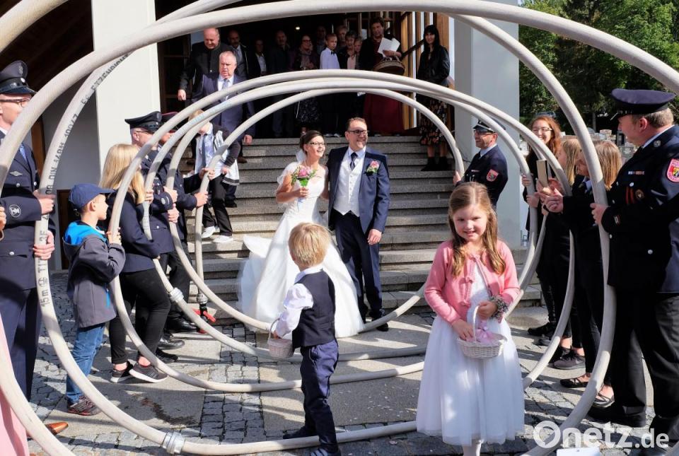 Mit dem kirchlichen Segen krönten sie ihre Beziehung. Vor der Kirche hatte die Etzenrichter Wehr, bei der Markus aktiver Feuerwehrmann ist, und die Jubiläumsfestdamen, zu denen Maria gehörte, ein Schlauchspalier aufgebaut, durch das die frisch vermählten Eheleute schritten. Im Anschluss gratulierte Alex Greitzke dem Paar im Namen der SV-Fußballsparte. Für den Kirwaleit-Verein, bei dem beide Mitglieder sind, gratulierte Maximilian Rösch und lud Maria und Markus zu einem Trinkspiel ein.