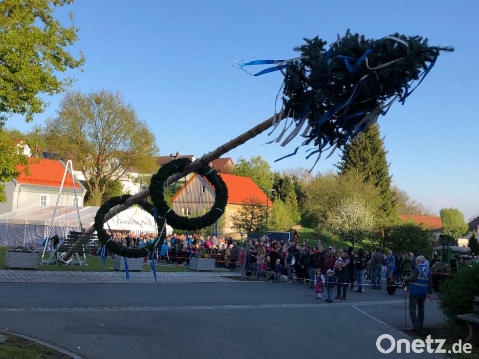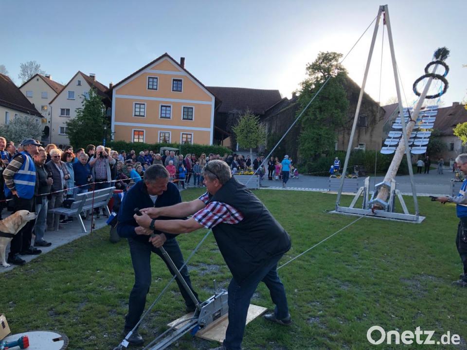Das im vergangenen Jahr extra konstruierte Maibaum-Gestell hat sich bewährt. Mit Hilfe eines Seilzugsystems konnte der Baum mit Muskelkraft in die Senkrechte gehievt werden. Die Bürgermeister Martin Schregelmann und Hans Beutner versuchten sich unter den Augen Hunderter Besucher auch und kamen ganz schön ins Schwitzen. Nach dem Anbringen der Zunftzeichen hatten Bastian und Thomas Kaiser noch eine Überraschung für die Besucher parat. Die Zwillinge hatten sich in den vergangenen zwei Wochen das "Goislschnalzen" beigebracht und ließen die Riemen gleich richtig klatschen.