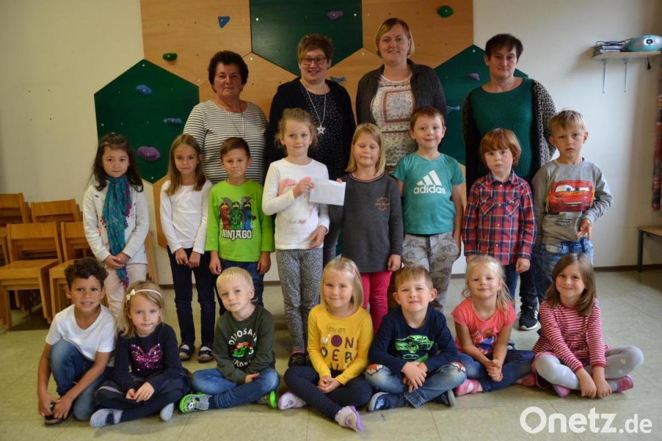 Der Erlös aus der Tombola beim Etzgersriether Dorffest kam den Kindergarten zugute. Die 2. Vorsitzende Hildegard Balk, Vorsitzende Lisa Ach überreichten das Geld an die Leiterin Veronika Janda mit dabei Schatzmeisterin Christine Höger (von links). Lautstark sagten auch die Vorschulkinder Dankeschön.