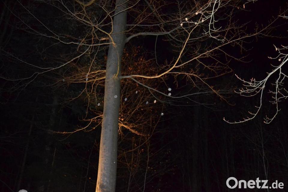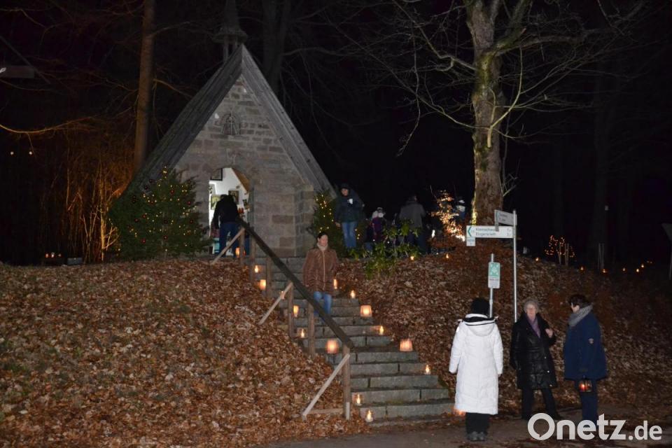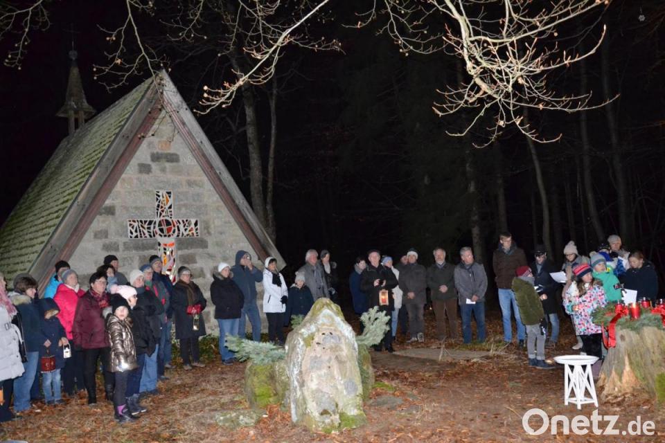 Ein besonderes Erlebnis war die Eröffnung des ersten Adventsfensters bei der Rotkreuz-Kapelle. Die Feuerwehr hatte die Kapelle mit Lichtern geschmückt, die nun erstrahlten. Mehr als 150 Besucher aus Etzgersrieth, Moosbach, Tännesberg und umliegenden Landkreisen staunten. In den Händen hielten sie Eiskristalle, die die Ministranten gebastelt hatten. Das Bläserquintett aus Moosbach spielte Adventslieder. Welch romantische Atmosphäre, passend zum Motto des Abends: „Schau hin und staune“. Der Advent lade ein, einmal tiefer auf die Schöpfung zu blicken, sagte Pfarrer Josef Most. Im Leben gebe es viel zu bestaunen, insbesondere den Menschen, den Gott so wunderbar geschaffen habe. Rudolf Mitlmeier, Vorsitzender der Feuerwehr, mahnte an innezuhalten, um neu auf das Leben und die Welt zu blicken. „Gott ist uns ganz nah. Das Feiern wir an Weihnachten.“ Diesen Worten ließen die Bläser den Ausruf „Macht hoch die Tür“ folgen und spielten weitere Stücke. Matthias Balk las das Bibelwort. Die Fürbitte trugen Michael Steinhilber und Lena Weiß vor. Die Ministranten stellten Lichter in eine Schale. Anschließend beteten alle das Vaterunser und Pfarrer Most erteilte den Segen.