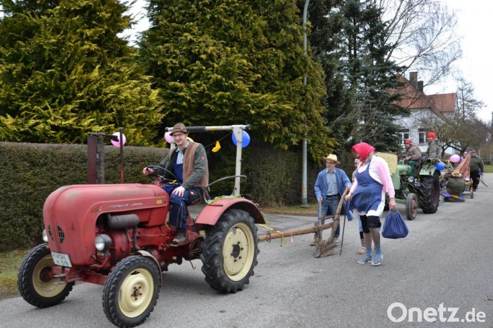 Der Faschingsverein ließ am Samstag eine alte Etzgersriether Dorftradition wieder aufleben. Die Mitglieder trafen sich am Schulhaus zum „Fosnacht asackern“ (Fasching ausackern). Dabei hatten sie am Oldtimer-Traktor einen alten Holzpflug angespannt. Sie hatten sich auch wie zu Großmutters und Großvaters Zeiten gekleidet. Hinter dem Pflüger wurden Sägespäne gestreut, was die Aussaat von Getreide in die Ackerfurche bedeuten soll. Damit die Narrensaat gut aufgeht wurde sie breit ausgestreut und mit den Holzrechen eingerechnet.