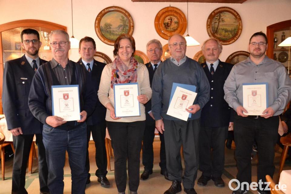 Die Vorsitzenden Rudolf Mitlmeier und Fritz Steinhilber zeichneten in der Versammlung treue Mitglieder mit Urkunden aus. 25 Jahre: Christine Ring, Christian Meier, zweiter Vorsitzender Fritz Steinhilber, Heike Hammerl und Markus Sauer. 50 Jahre: Ernst Ring. 60 Jahre: Heinrich Ring.