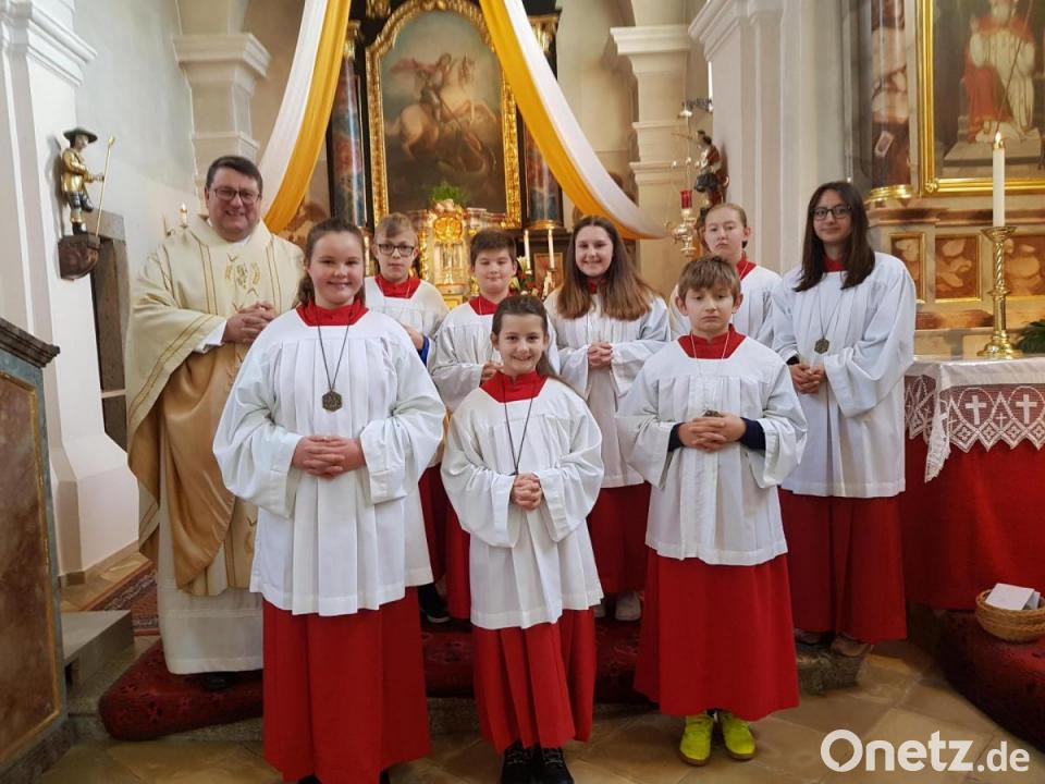Im Rahmen dieses Gottesdienstes wurden zwei neue Messdiener in die Schar der Ministranten aufgenommen. Dazu haben sich Emily Schnupfhagn und Alisa Picka bereiterklärt, sagte Oberministrantin Selina Seidl. Vor dem Geistlichen bekundeten beide ihre Bereitschaft. Anschließend segnete der Priester die Plaketten, die sie als Zeichen ihres Dienstes als Ministranten erhielten. „Ihr sollt sie mit Freude tragen“, sagte Pfarrer Klösel zu ihnen. Er dankte auch den Eltern für die Unterstützung. Die Fürbitten trugen die Ministranten vor. Musikalisch begleitet wurde der Gottesdienst an der Orgel von Markus Mathy aus Waidhaus. Auf ihren Ministrantendienst wurden sie von Jutta Steinhilber und vom Theologiestudenten Michael Steinhilber sowie von den beiden Oberministranten Lena Weiß und Selina Seidl vorbereitet. Die Expositur Etzgersrieth hat somit insgesamt zehn Ministranten.