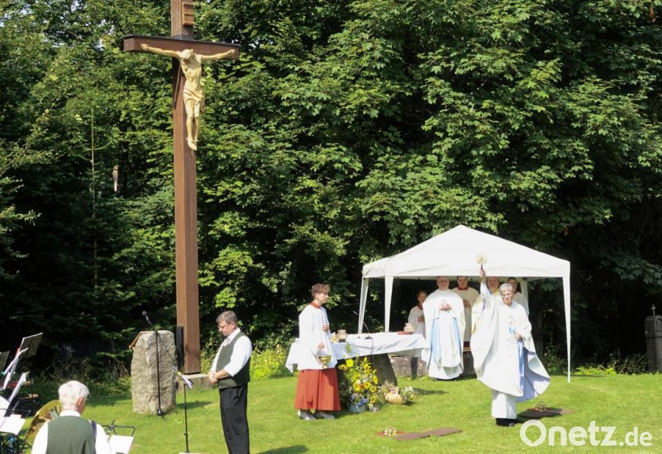 Zum Schluss der Frauentagsfestmesse weihte und segnete der Waldthurner Pfarrer Norbert Götz die neue Christusfigur am Kreuz am Freialtar, die kürzlich dort neu angebracht worden ist und traditionell auch die mitgebrachten Kräuter.