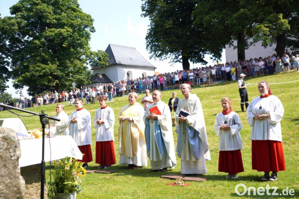 Lediglich der Hauptzelebrant des Tages, Regionaldekan Markus Brunner aus Amberg, hatte sich verkehrsbedingt um einige Minuten verspätet. Selten dürfte er den Einzug zum Gottesdienst im Laufschritt vollzogen haben, was die vielen Gläubigen am Fahrenberg-Freialtar mit einem anfeuernden und freundlichen Applaus quittierten. Die Trachtenkapelle Waldthurn unter der Leitung von Josef Pflaum senior spielte in der heißen Sonne am Freialtar auf, Maria Eckert aus Schammesrieth sprach die Lesung und Fürbitten.