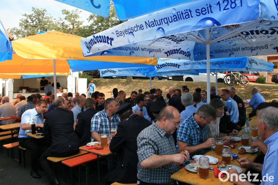 „Ich freue mich jetzt auf das Weißwurstessen und erlaube mir, Sie alle im Namen des Vereins dazu einzuladen“, bat Pfarrer Roeb um Teilnahme am Frühschoppen und zum gemeinsamen Zug an das Gerätehaus, wo bereits die Bierkrüge vorgeschenkt und die Weißwürste heiß gemacht worden waren. Nachgerückt war auch die Falkenberger Blasmusik, um mit schmissigen Melodien das bereits gestartete Fest auf ihre Art kurzweilig zu gestalten. Kaffee und Kuchen wurden zu passender Zeit im Obergeschoss des Gerätehauses angeboten. Falkenberger Zoigl floss aus dem Zapfhahn. Am Grill brutzelten Bratwürste und Steaks und fanden laufend Abnehmer.