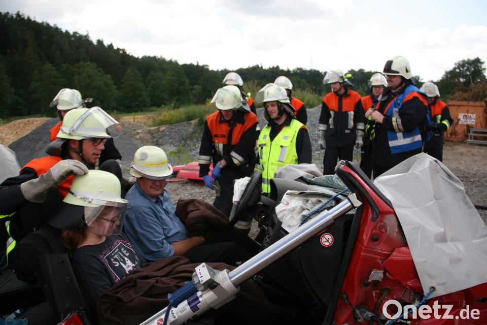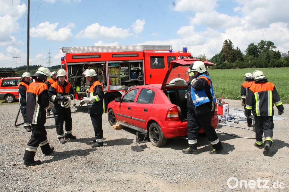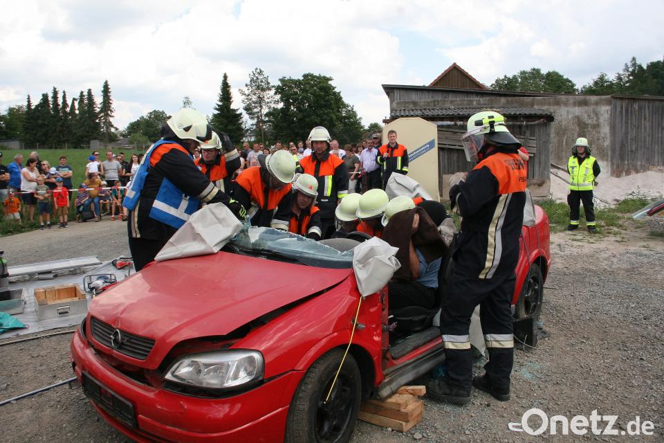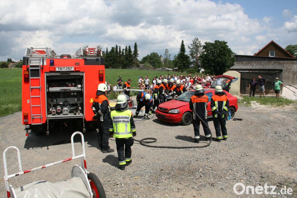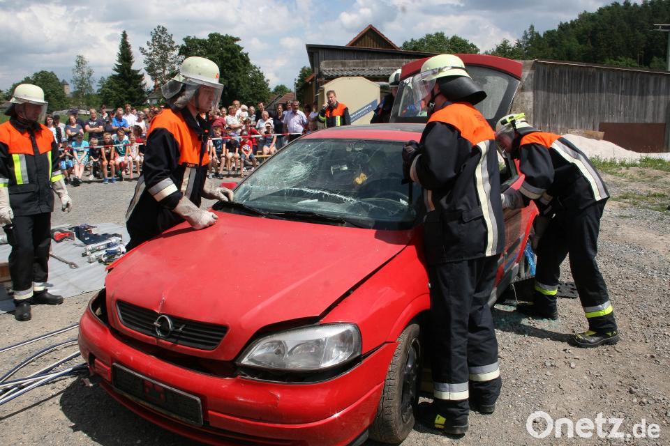 Martinshörner und eintreffende Feuerwehrfahrzeuge rissen um 14 Uhr die Gäste erneut aus ihrer Stimmung. In schneller Fahrt und mit Blaulicht eilten Wiesauer Einsatzkräfte zum nahen Gemeindebauhof. Nach Informationen von Kommandant Thorsten Meiler hatte sich dort ein schwerer Verkehrsunfall mit zwei Schwerverletzten ereignet. Das Unfallfahrzeug drohe in Brand zu geraten, lautete die zusätzlichen Information an die Feuerwehrleute. Ein vorsorglich über die Straße gespanntes Sperrband hielt die Neugierigeren, die sich bereits versammelt hatten, vom "Unfallort" zurück. Anders als sonst waren Zuschauer aber diesmal ausdrücklich erwünscht. Als „Geburtstagsgeschenk“ hatte die Wiesauer Wehr eine Schauübung versprochen. Kommandant Meiler erläuterte die Arbeiten, bei denen mit geeignetem Werkzeug – Löschwasser stets bereit - die eingeklemmten Falkenberger zu befreien waren. Mit geleitet wurde der Übungseinsatz vom zweiten Kommandanten Christian Blohmann. Das Geschehen verfolgte auch der erste Kommandant der Falkenberger Wehr, Andreas Zölch. Nach eindrucksvollen 20 Minuten waren die „Verletzten“ geborgen. Die Gefahr eines Kfz-Brandes war gebannt. Der verdiente Lohn: Mit Falkenberger Zoigl und einer Brotzeit durfte weitergefeiert werden.