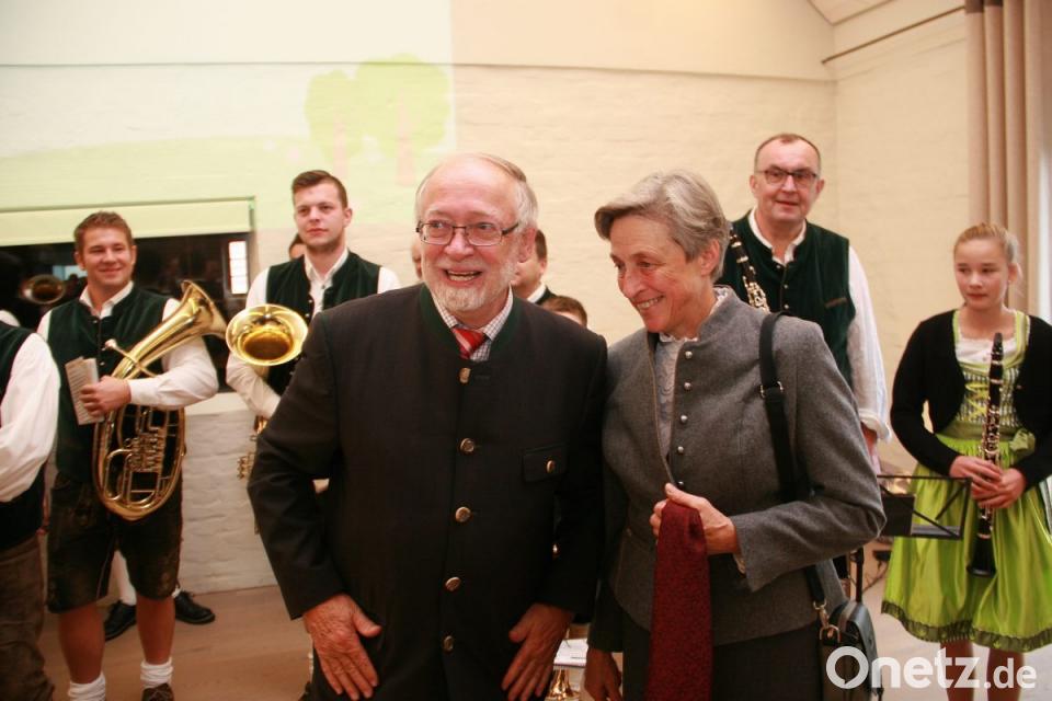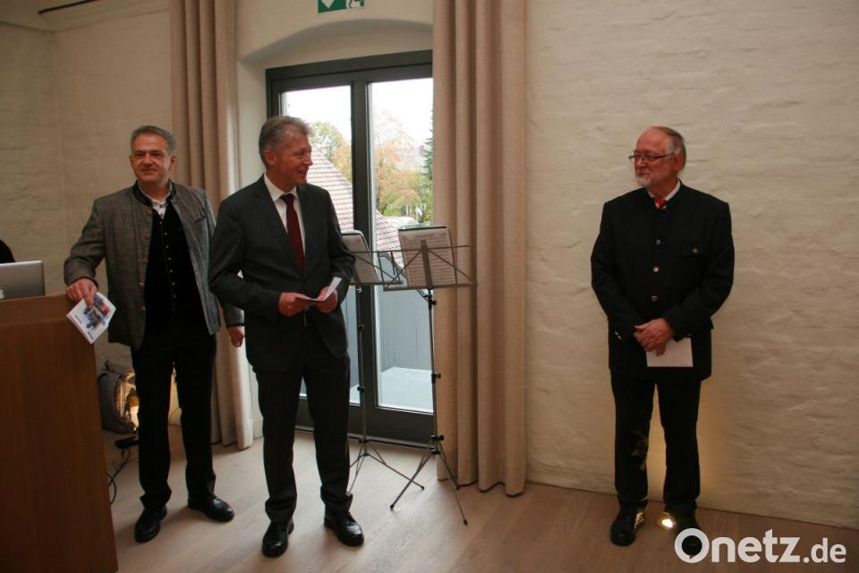 Im Namen des Bayerischen Gemeindetages würdigte Vorsitzender Lothar Müller die Verdienste seines Stellvertreters. Der Plößberger Bürgermeister bat um einen Tusch, zu ihm ans Rednerpult gesellte sich auch Roland Grillmeier in seiner Funktion als Vertreter des Landrats. „Das, was du geschaffen hast, ist unübersehbar“, stellte Lothar Müller das „Leuchturmprojekt Burg“ in den Mittelpunkt. Als „Burgherrn, Zoiglbaron und Ideenschmiede“, titulierte Roland Grillmeier den Jubilar. „Was wäre Falkenberg ohne Herbert Bauer? Wir sind stolz auf dich, dein Wort hat Gewicht“, schloss Grillmeier.