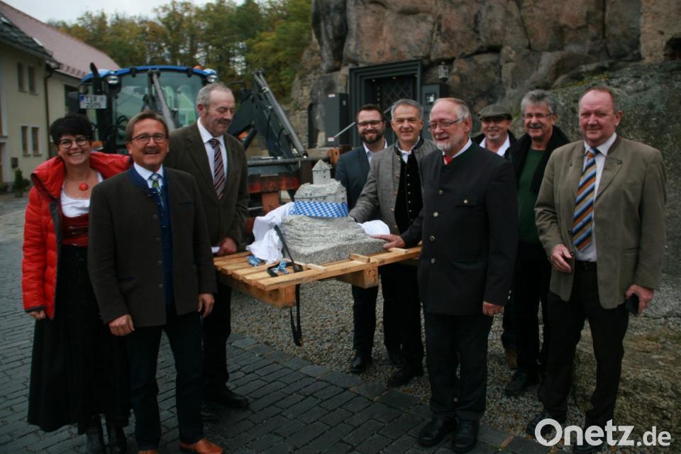 Im Namen der Marktgemeinde sprach 2. Bürgermeister Bernhard Schuller. „Deine ehrenamtliche Bürgermeister-Tätigkeit geht weit über das Erwartete hinaus“, so Schuller. Als ehemaliger Pädagoge liege Bauer auch die Sicherung der Grundschule am Herzen. „Aufopferungsvoll widmest du dich der Burg“, ergänzte Schuller. „Dein zweites Zuhause möchte dir die Gemeinde in verkleinerter Form schenken." Mit diesen Worten bat Schuller den Jubilar nach draußen, wo eine versprochene Überraschung wartete: eine Miniatur der Falkenberger Burg, aus Granit gefertigt. Sie werde einen Ehrenplatz erhalten, versprach Herbert Bauer sichtlich gerührt.