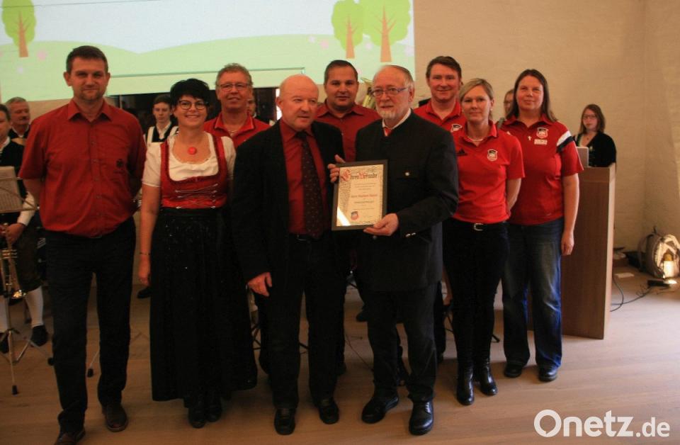 Im Namen des Vereins „Forum Falkenberg – Freunde der Burg“ gratulierte Gerhard Pöschl. „Alle Verdienste aufzuzählen, würde den Rahmen sprengen.“ Ein besonderes Mitbringsel hatte die DJK Falkenberg vorbereitet: eine Urkunde mit der Ernennung von Herbert Bauer zum Ehrenmitglied. Den Worten seiner Vorredner schloss sich auch Bürgermeister Toni Dutz im Namen der Nachbargemeinde Wiesau an. Er erinnerte daran, dass Bauer bei der Wiedereröffnung der Burg von Horst Seehofer „Oberbürgermeister“ genannt wurde. "Den Titel, den du als einziger im Landkreis trägst, hast du mit Recht erhalten“, sagte Dutz und erinnerte auch an die Beharrlichkeit des Falkenbergers. Für „schwere Stunden“ sei das Wiesauer Brunnenwasser gedacht, empfahl Dutz.